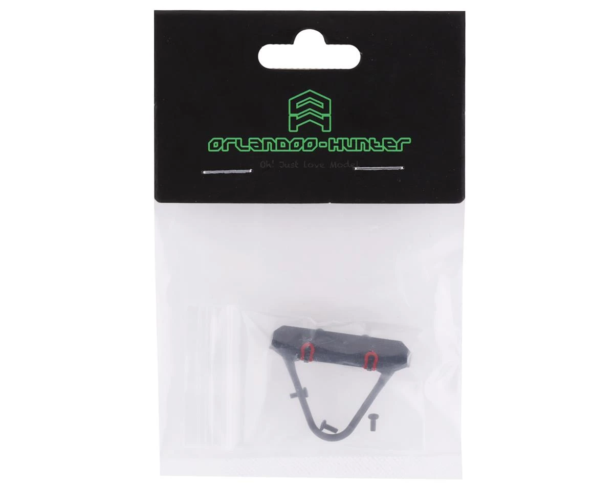 Orlandoo Hunter OH35A01 Metal Stinger Front Bumper with D-Rings. This optional bumper is a great scale accessory that not only looks good but can also help with crawling up obstacles. Package includes one black front bumper with D-rings.