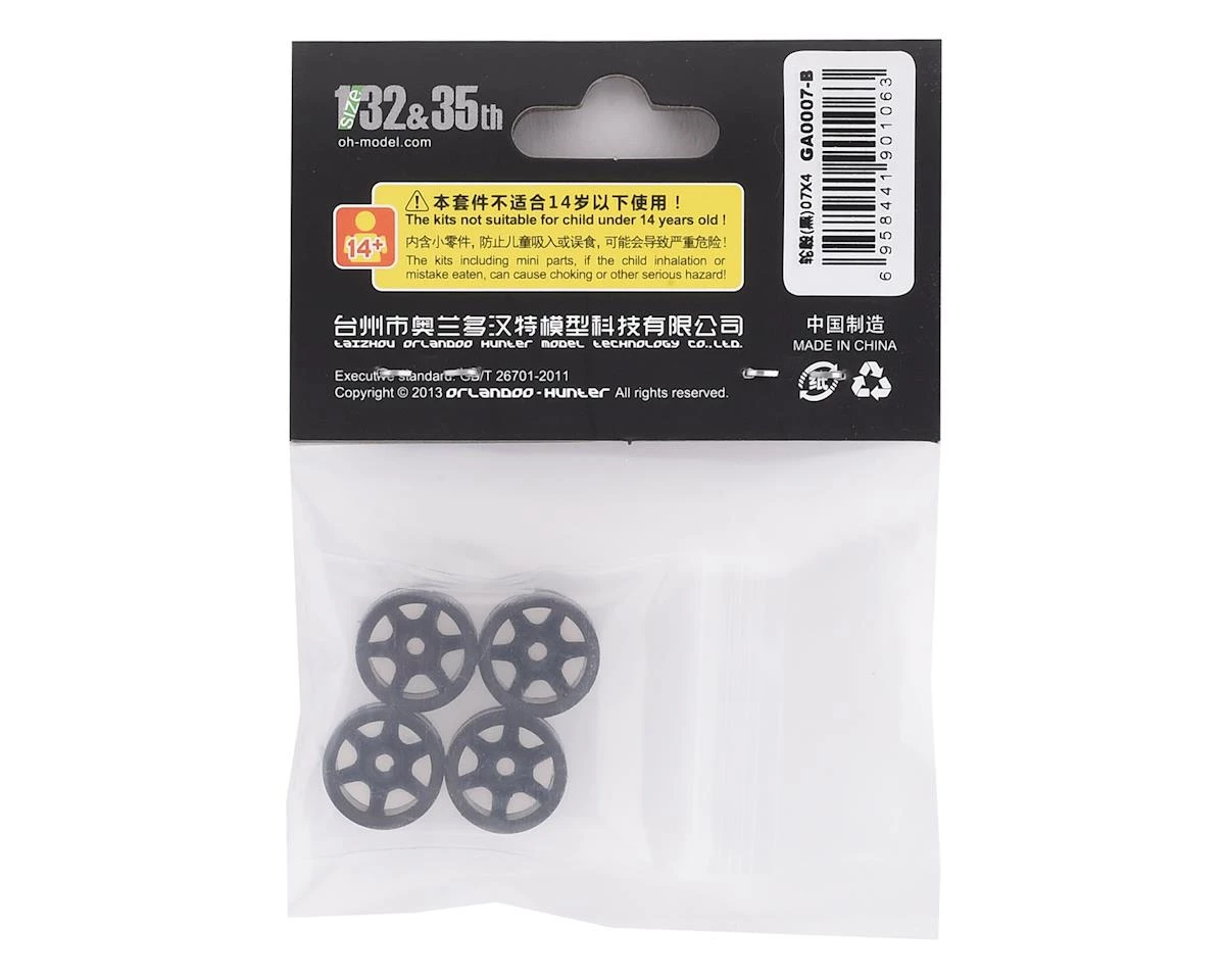 Orlandoo Hunter Type 7 Wheel Set. These optional wheels features a six spoke design, and give you a custom wheel choice that fits the size and scale of your Orlandoo 35A01 Jeep or 35P01 F150 kit perfectly. Package includes 4 wheels.
